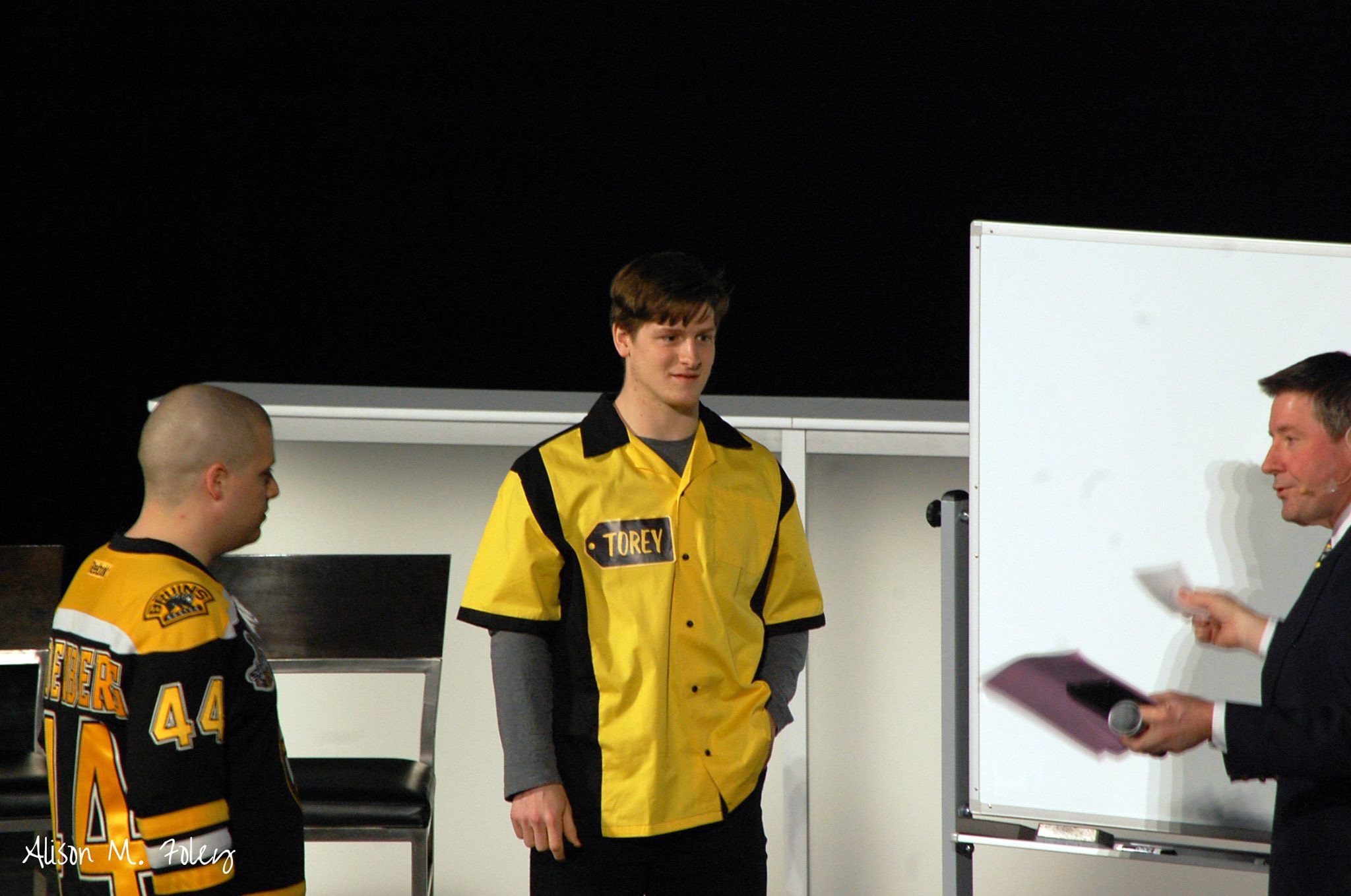 Torey Krug and a fan participate in the Bruins game show event (Photo courtesy of Alison M. Foley)